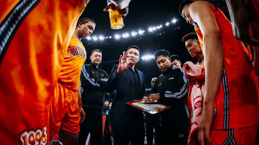 上海男篮主教练卢伟(中)布置战术 李铭珅 摄