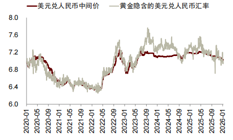 其实黄金更接近理论中的可贸易品,其价格的确在全球地区间的差别是比较小的。经过汇率换算之后上海金和伦敦金的价格差别很小(图表4)。如果用上海金和伦敦金的价格来推算一个人民币兑美元汇率,其结果与现实中的人民币中间价汇率就基本相同(图表5)。例如,2026年1月7日,伦敦金价格为4438美元/金衡盎司,上海金为999.68元/克,用其推算的美元兑人民币汇率为7.01,而当日的美元兑人民币中间价为7.02,两者基本相同。